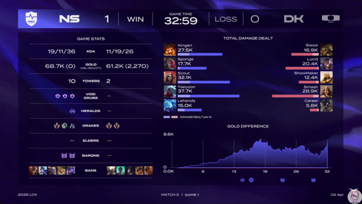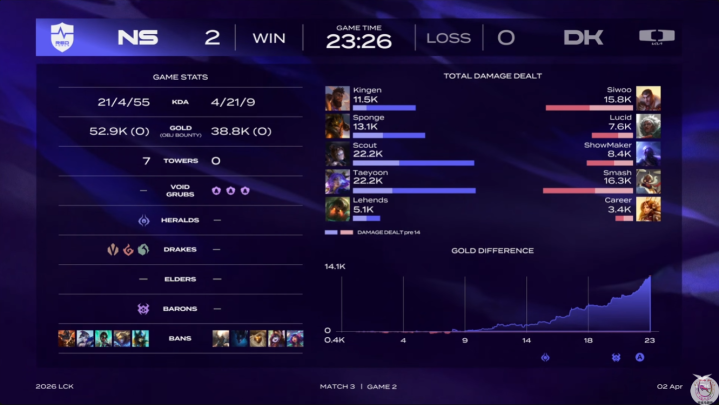 第二赛段两支队列的首秀局,NS有Scout追想LCK加盟,但此前的发扬并不睬念念,而DK本年第一赛段打出了还可以的收货,尤其是让二追三淘汰T1,应该是成为了大众印象最深的一幕。是以赛前当然是看好DK的更多,遵守万万没念念到在昨天T1被爆冷之后,今天DK亦然紧随其自后了个大爆冷。