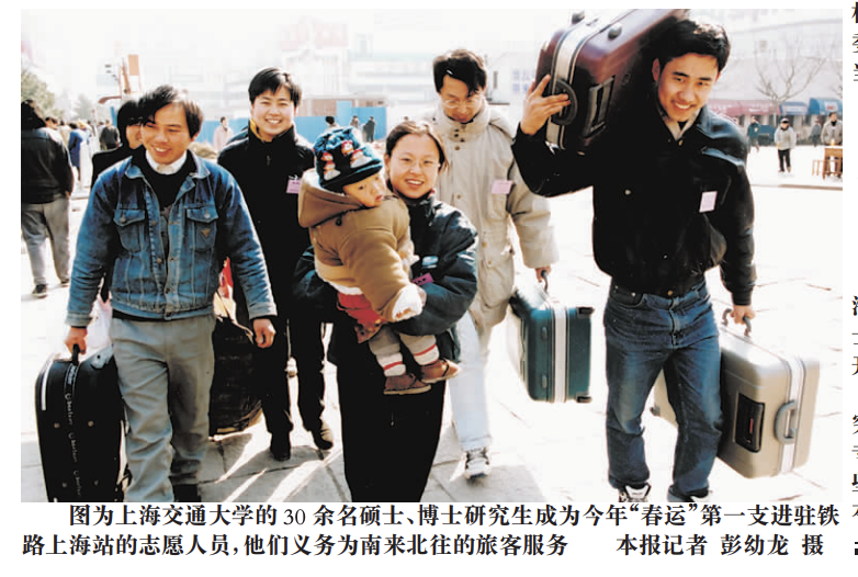 2000年,电子信息学院的30余名硕博士筹商生成为第一支开进铁路上海站地区的志愿服务东说念主员。其时这些筹商生底本是诈欺寒假搞一些结合专科的为民服务,但看了本报不妨一议栏目《要问路,先给钱》的专题筹商后,就主动请缨,到上海站广场为走动走动的搭客义务指路,并提供接头服务。