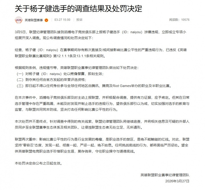 直播吧03月27日讯官方音信,LPL公布对TES打野选手naiyou的处罚公告!